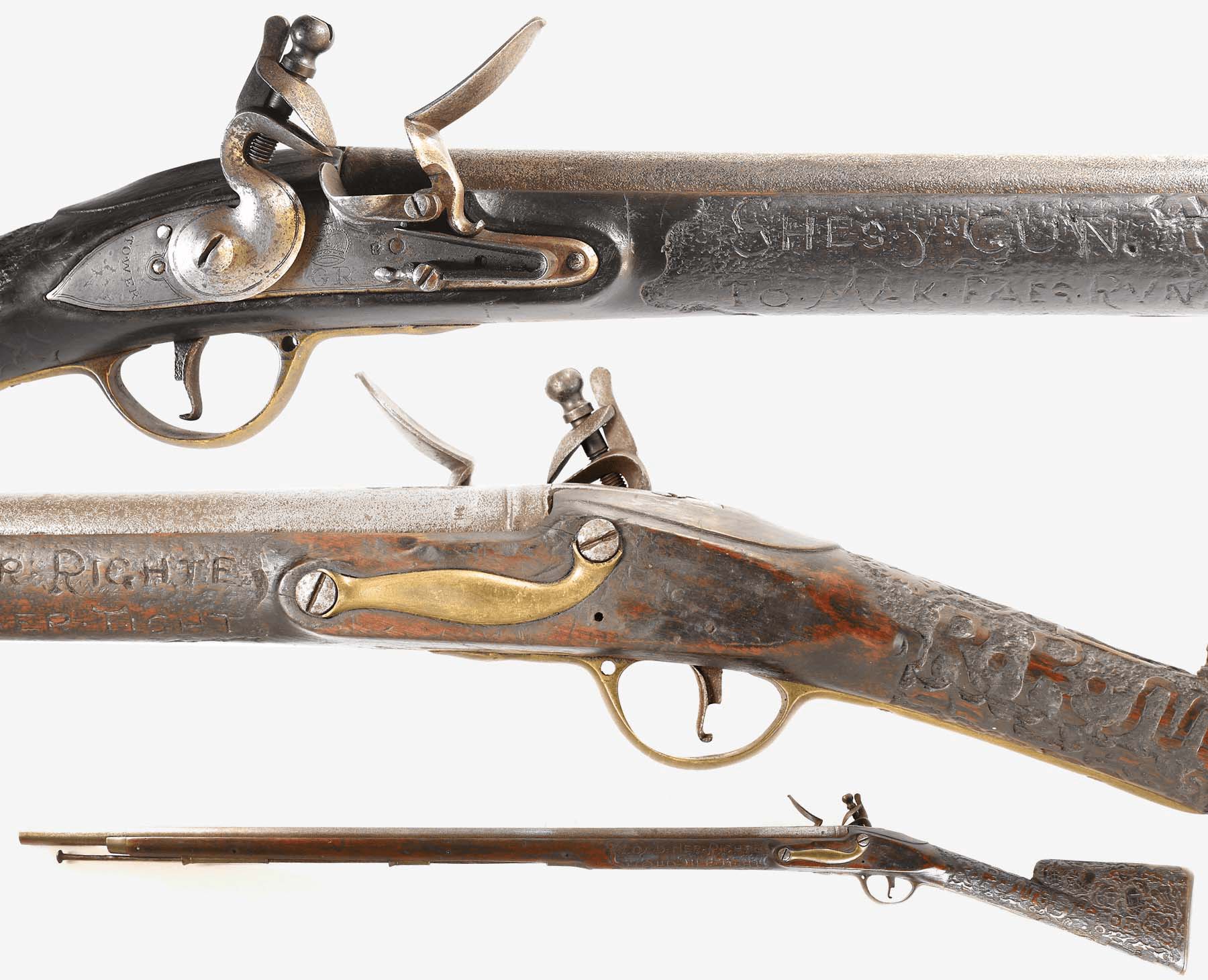 On the other side carved R R McGregor, on the forestock carved Load Her Righte, Hold Her Tight on the left hand side and Shes gun to mak faes run. Stock carvings filled with thistle, acorn and lion motifs throughout. Brass furniture, long butt cap spur and convex brass side plate. Rounded brass trigger guard with rounded finial. Lock and barrel marked WG for William Grice. Three brass ramrod pipes and iron ramrod.